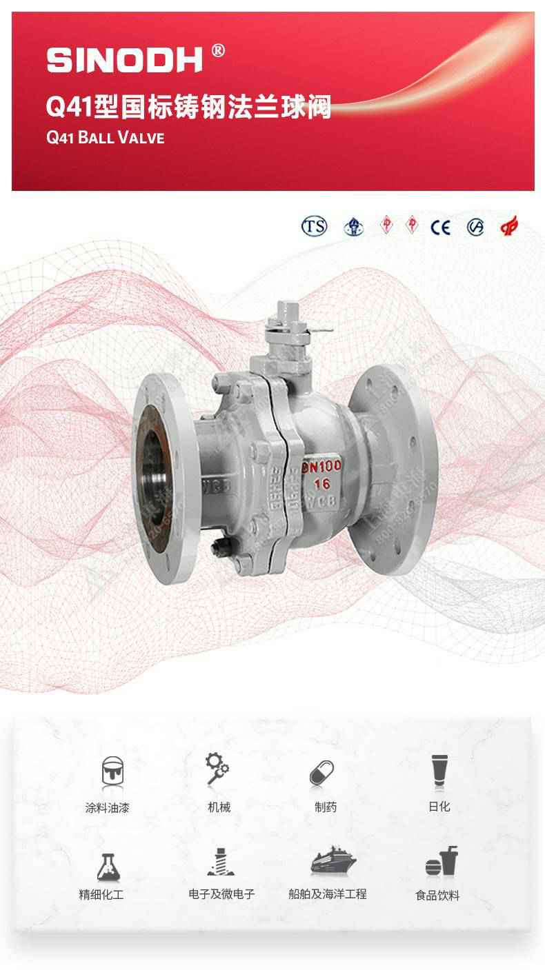 Q41型国标铸钢法兰球阀,为米乐网页版登录官网-米乐(中国)自主研发生产。本产品设计制造标准符合GB/T12237、GB/T12224标准。该产品的球体在介质压力作用下球体能产生一定的位移并紧压在出口端的密封面上,保证出口端密封。适用于水、溶剂、酸和天然气等一般工业介质也适用于工况恶劣的介质,如氧气、过氧化氢、甲烷和乙烯等介质。